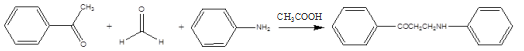 1.1曼尼希堿型酸化緩蝕劑 曼尼希堿(Mannich base)是指甲醛、胺與含有活潑氫原子的化合物的縮合反應產物。曼尼希堿作為緩蝕劑效果較好、發展前景樂觀,尤其是其在油田酸化作業中作為高溫濃鹽酸的緩蝕劑而倍受重視. 曼尼席堿的合成方法為:在裝有攪拌器、回流冷凝管和溫度計的三口燒瓶中加入一定量的甲醛(甲醛水溶液、多聚甲醛或能釋放出甲醛的化合物)、含活性氫原子的酮(環己酮或苯乙酮等)、有機胺(環己胺或苯胺等),加入一定量的醇為溶劑,加少量酸(鹽酸或醋酸)為催化劑調節pH值,加熱在回流溫度下反應生成紅棕色的曼尼希堿。下式是以甲醛水溶液、苯胺、苯乙酮為原料,以醋酸為催化劑合成曼尼席堿的反應式: